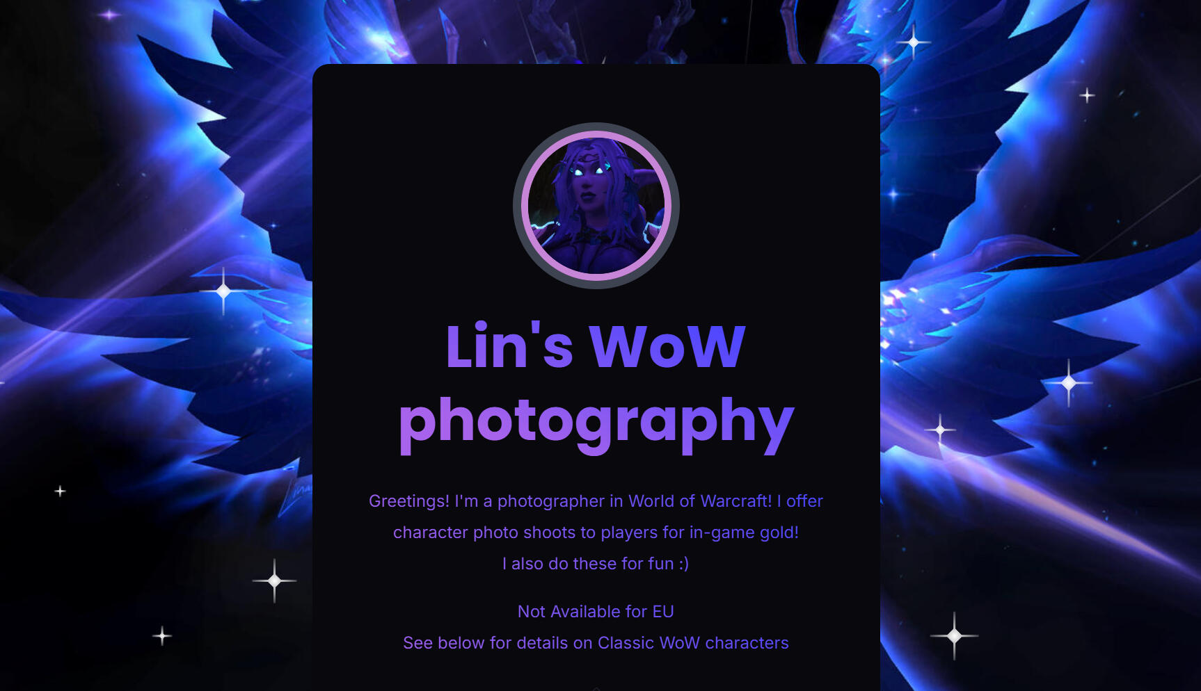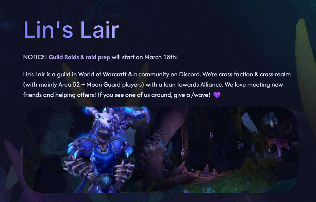Greetings everyone! I'm Linandreith (or just "Lin" for short!) and I've been playing WoW for as long as I can remember! I'm mainly a farmer/collector, and I've got lots of fun stories to tell.I love making art & cute lore of my characters, gaming, learning about random cool stuff I find, and streaming! Come stop by my Twitch channel sometime and say hi 💜You can reach me on Discord/Twitter as "Linandreith" or by joining my server. My links ↓